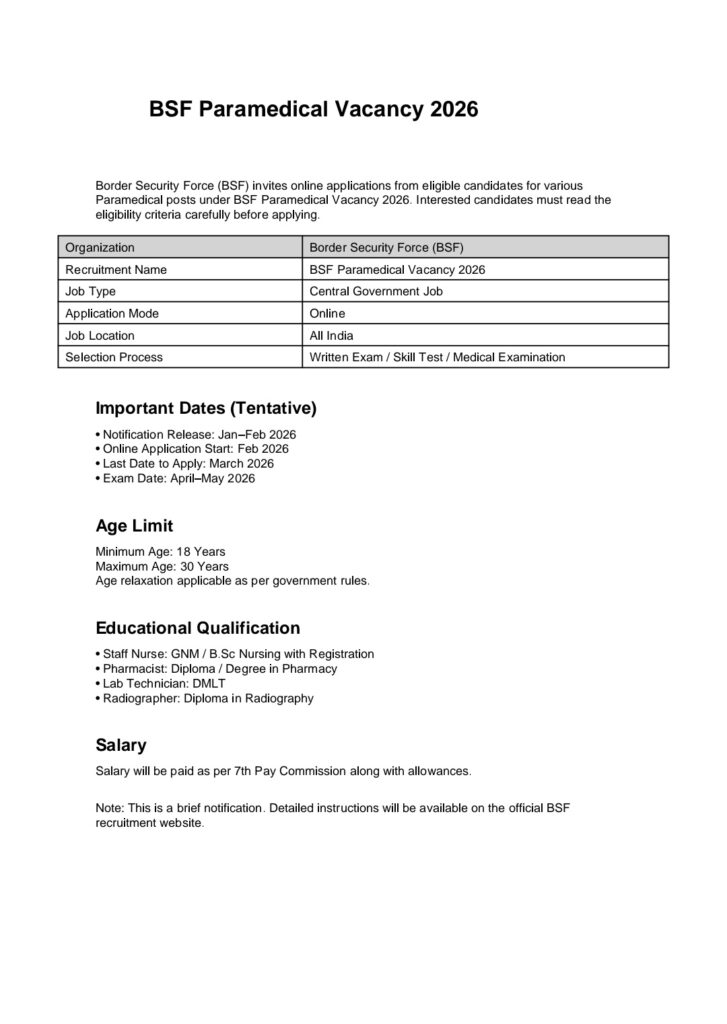 | Apply Online Link | BSF Paramedical Vacancy 2026 Apply Online | Available Soon |